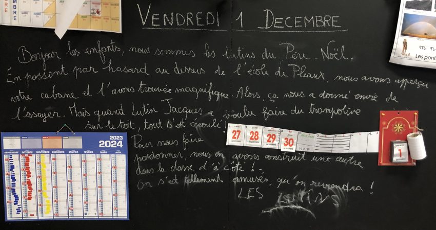 Vendredi 1ᵉʳ décembre, quand nous sommes rentrés dans notre classe, les lutins étaient venus s’amuser et avaient détruit la cabane construite par les CP. Voici le message qu’ils nous ont laissé…