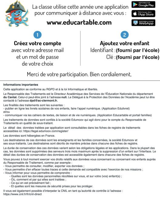 Nous expérimentons pour septembre-octobre 2025 l’application éducartable. Avec le portail famille, vous pourrez directement depuis votre téléphone (app) ou sur l’ordinateur consulter les devoirs et avoir accès à la vie de la classe (photos).
